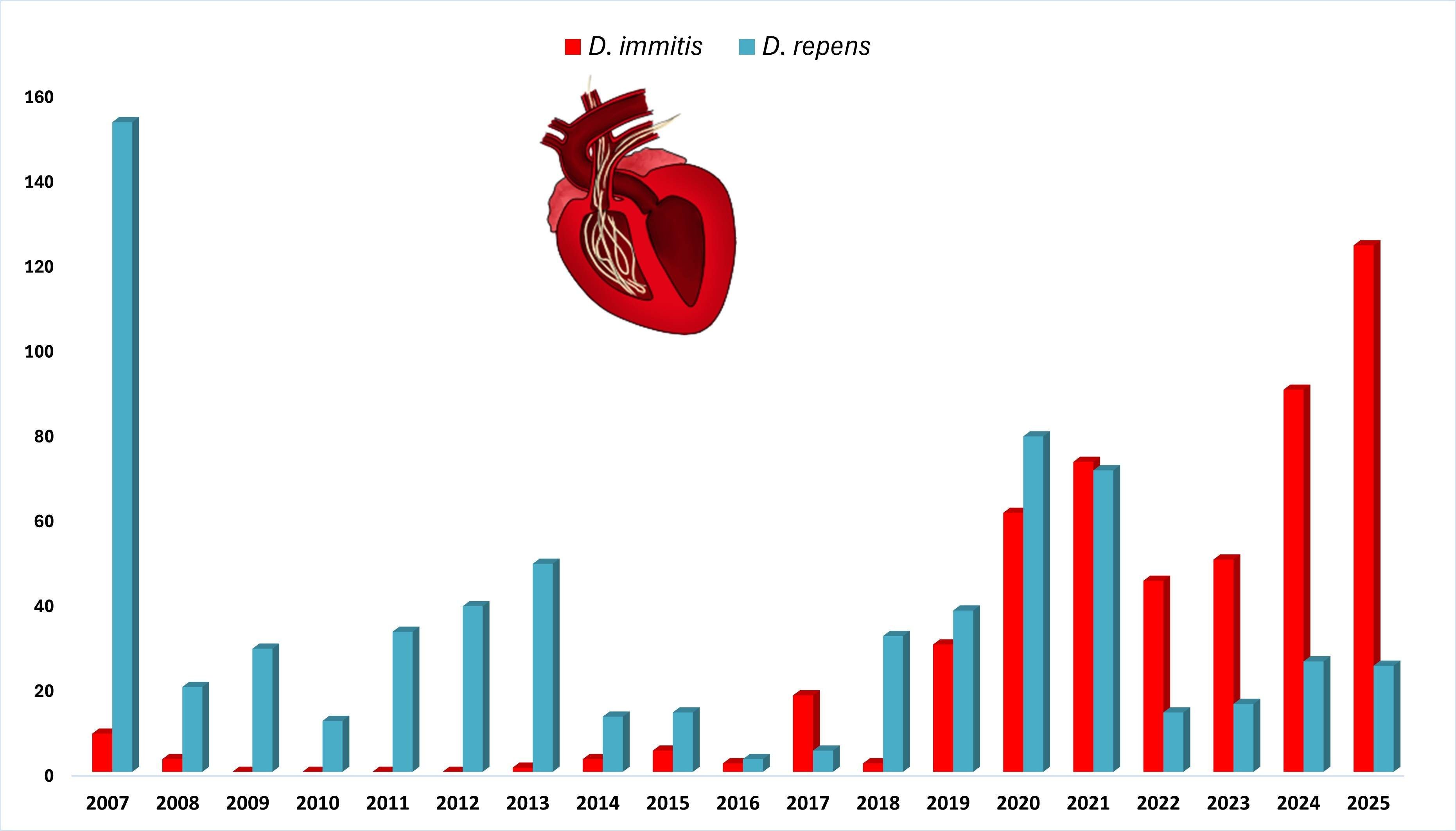 Na území Slovenska bola dirofilarióza u psov po prvý krát diagnostikovaná v roku 2005 v okresoch Komárno a Bratislava pri bežnom laboratórnom vyšetrení krvi. Už prvý prieskum, ktorý bol realizovaný na Parazitologickom ústave SAV v Košiciach v roku 2007, odhalil výskyt endemických oblastí (kde parazit trvalo cirkuluje) na území Podunajskej nížiny, Záhoria a Východoslovenskej nížiny. Dirofilarióza bola vtedy potvrdená u takmer 35 % vyšetrených psov, pričom vysoká pozitivita bola zaznamenaná u pracovných psov (policajné, poľovné a strážne). U všetkých infikovaných psov bol dokázaný tzv. autochtónny charakter ochorenia potvrdzujúci, že všetky psy sa nakazili na území Slovenska. Analýzou DNA bolo v tomto prvom prieskume zistené, že 93 psov bolo infikovaných menej nebezpečným druhom D. repens a trpelo kožnou alebo očnou formou ochorenia, a len u 6 psov bola zistená zmiešaná forma infekcie druhmi D. immitis aj D. repens. Trend jednoznačnej prevahy D. repens pretrvával celé desaťročie, až do roku 2017, keď sa začalo objavovať čoraz viac prípadov pľúcnej, resp. srdcovej dirofilariózy, vyvolanej druhom D. immitis. V rokoch 2017 až 2021 bolo zastúpenie oboch druhov dirofilárií v diagnostikovaných prípadoch ochorenia vyrovnané, a po roku 2021 došlo k výraznému obratu. U väčšiny infikovaných psov žijúcich v endemickom regióne (okresy Nové Zámky a Komárno) bola potvrdená prítomnosť druhu D. immitis, pričom viaceré prípady infekcie sa skončili úhynom pacientov. Vývin opísanej situácie je graficky znázornený na obrázku 3.