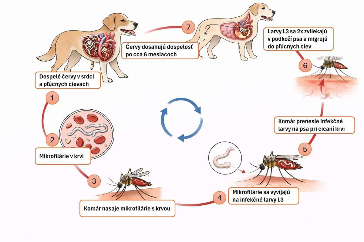 Pôvodcom ochorenia sú nitkovité parazity z rodu Dirofilaria dosahujúce dĺžku 10 až 30 cm. V Európe sa u psov vyskytujú dva druhy: Dirofilaria repens a Dirofilaria immitis. Dospelý parazit žije u psa buď v podkoží a oku (druh D. repens), alebo v pľúcnych cievach a srdci (druh D. immitis). Samičky rodia drobné larvičky – mikrofilárie, ktoré cirkulujú v krvnom obehu hostiteľa. Prenášačom a zároveň medzihostiteľom parazita sú rôzne druhy komárov. Mikrofilárie sa pri cicaní krvi dostávajú do organizmu komára, kde sa vyvíjajú na infekčné štádium (tzv. infekčné L3 larvy). Vývin u komára trvá 2 až 6 týždňov a striktne závisí od teploty okolitého prostredia. Čím je vyššia teplota prostredia, tým rýchlejší je vývin parazita do infekčného štádia. Vývin sa zastavuje pri teplote nižšej ako 14 °C. Infekčné larvy sa pri opätovnom cicaní krvi dostávajú do organizmu ďalšieho hostiteľa, v jeho podkožnom tkanive sa dvakrát zvliekajú a potom migrujú, v závislosti od druhu, do pľúc, oka alebo ostávajú v podkoží. Celý vývin parazita u definitívneho hostiteľa trvá približne 6 mesiacov (Obrázok 1). Po dosiahnutí dospelosti a kopulácii samičky začínajú produkovať mikrofilárie a celý cyklus sa opakuje. Dospelé parazity môžu v organizme hostiteľa žiť až 7 rokov.